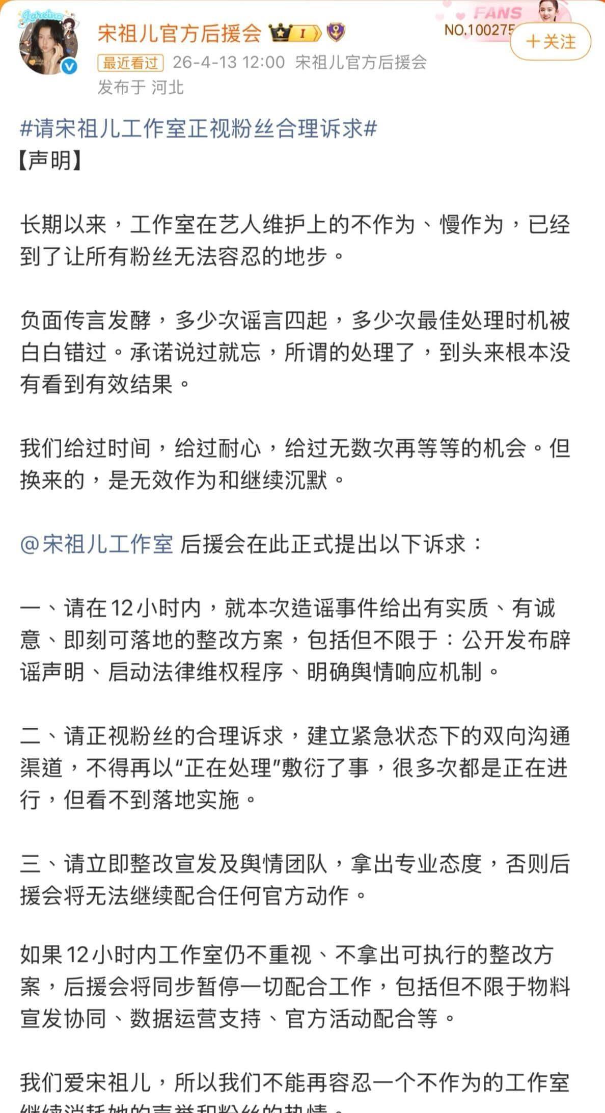面临愈演愈烈的外传,宋祖儿的粉丝后盾会率先坐不住了。 4月13日上午,后盾会颁布声明,立场显着地号令事业室尽速出头回应,澄清真相,阻难谣言持续鼓吹。 粉丝群体内部也呈现了差异的声响。 一局部人开首寻找驳斥的证据。 他们指出,“朵朵的瑰宝200810”这个账号正在2016年曾发过合于“上大学”的实质,而宋祖儿是2018年才考入北京影戏学院,时期上存正在冲突。 其余,该小号曾点赞过合于榴莲的实质,而宋祖儿正在众个公然局势都透露过本身厌烦榴莲。 另有粉丝提到,宋祖儿有一个公认的、操纵众年的小号叫“不凶的鹅”,这个新冒出来的号切实性存疑。